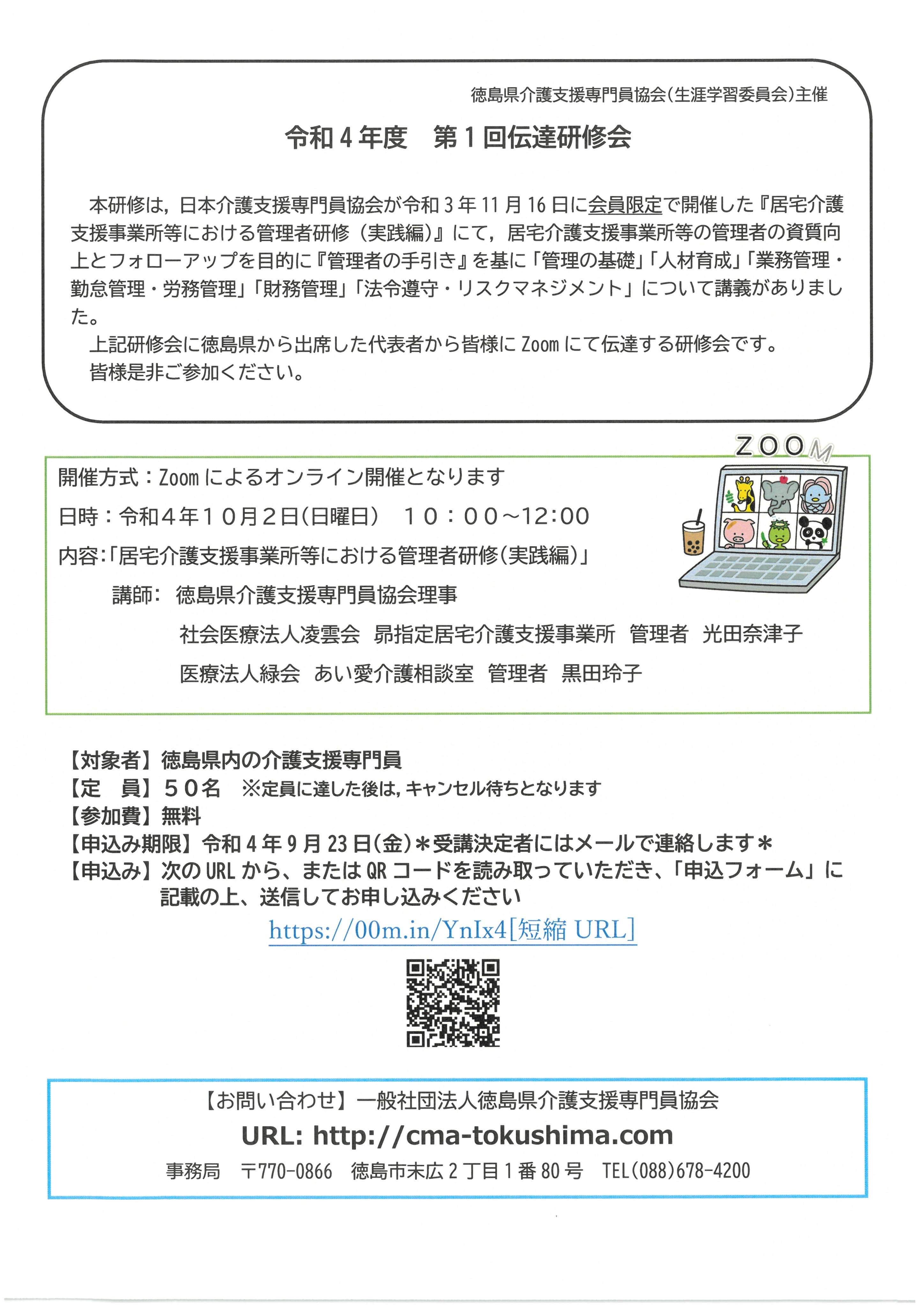 上記研修会に徳島県から出席した代表者から皆様にZoomにて伝達する研修会です。
